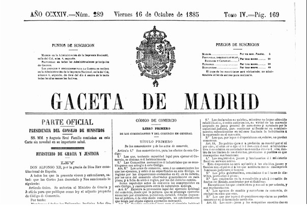La Ley mercantil más fundamental es el Código de Comercio de 1885.