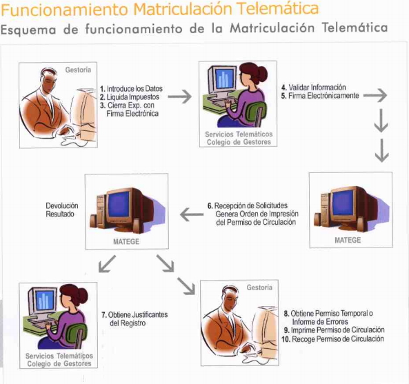 A partir de 2008 los gestores solicitan en línea en el Registro de Vehículos de la DGT los datos de matriculación desde su plataforma tecnológica, obteniendo así el número de matrícula de forma inmediata en sus despachos y expidiendo un permiso de circulación provisional. Desde entonces una de las ventajas reside en que se puede matricular de 08:00 am a 23:00pm, y de manera inmediata se pueden encargar las placas, seguros y el vehículo puede empezar a circular.